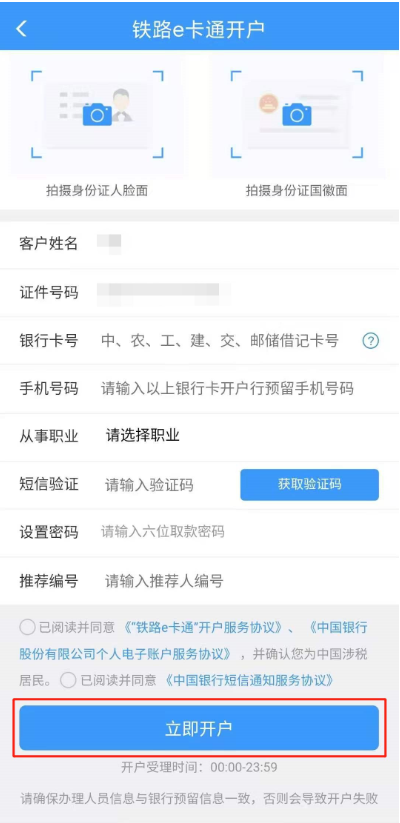 上传身份证正反面照片,绑定银行卡号,完善相关信息,点击【立即开户】。