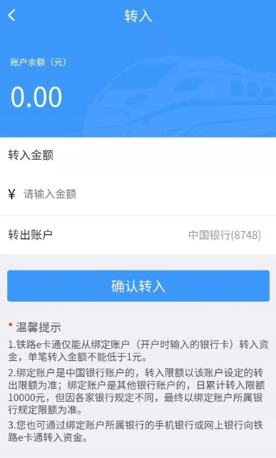 1、在铁路e卡通首页进入【转入】页面,界面自动显示当前账户余额。